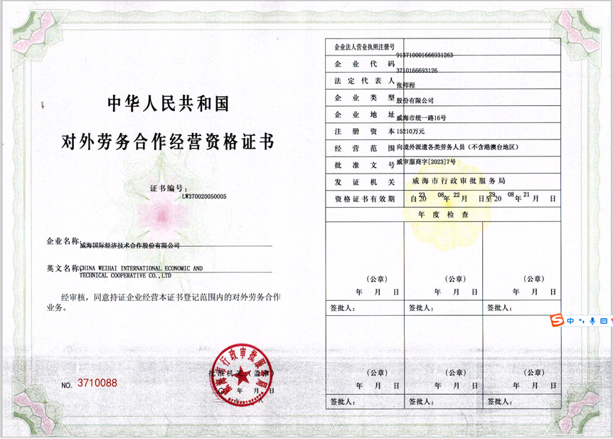 Copyright:Weihai International Economic & Technical Cooperative Co., Ltd.(c) Address :16 Tongyi Road, Weihai City, China  Lu ICP, number 12002982, -3 TEL:86-0631-5233588  FAX:86-0631-5224345  Lu public network security 37100202000269Number  Technical Support:Aosion